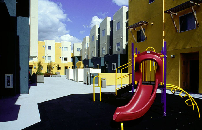 This affordable mixed-use development consists of 47 units, 72 parking spaces, and 13,300 square feet of commercial retail space on a 17,000 square foot urban site. Unit types range from two to four bedroom wood frame town homes and flats over a concrete podium, housing the ground floor commercial space and day care center.